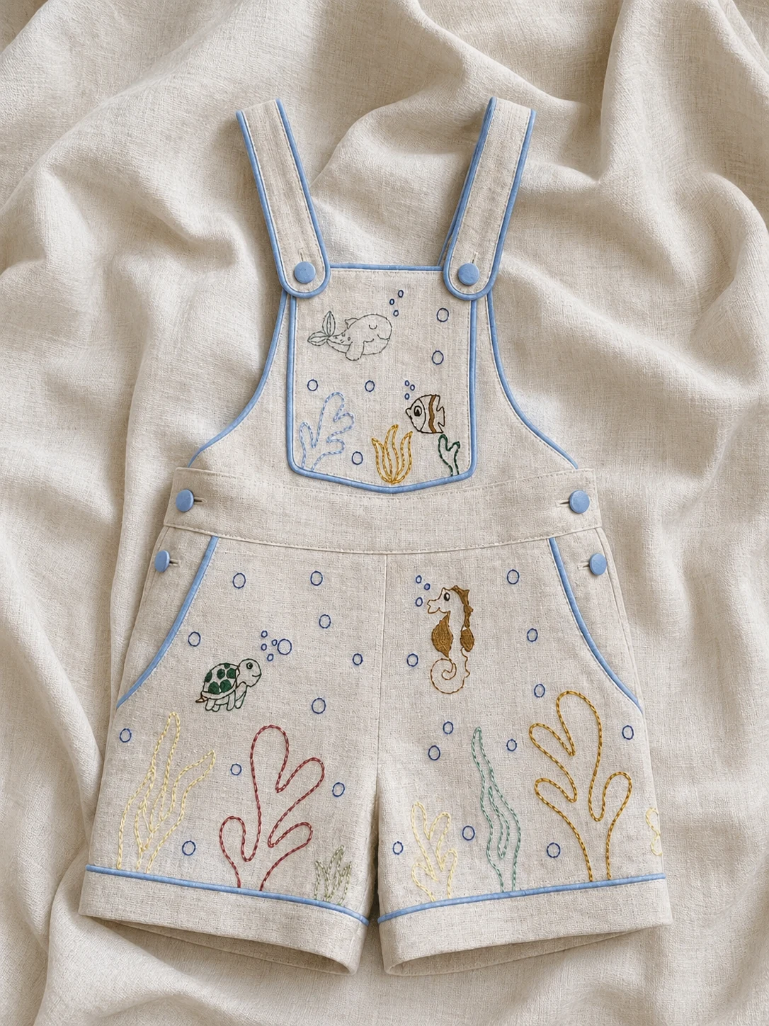 Ou imagina a versão veludo cotelê bordô pra batizado, com pesponto duplo em linha crua contrastante marcando cada beirada — assinatura visível da costureira. Ou a sarja premium verde oliva com linha preta contrastante e fivela latão envelhecido: é a peça de aniversário de 1 ano que a mãe guarda pra passar pro próximo filho.